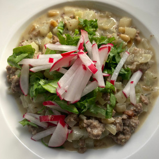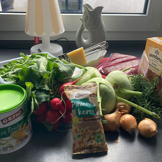 50 g Pinienkerne, 3 Kohlrabi (insgesamt ca. 1 kg), 2 EL Öl, 4 Zweige Rosmarin, Nadeln fein gehackt, 500 g Rindhackfleisch, 3 Zwiebeln fein gewürfelt, 350 ml Gemüsebrühe, 200 ml Sahne, 1-2 TL Speisestärke, 50 g Parmesan, Salz, Pfeffer, Radieschen, Rucola
