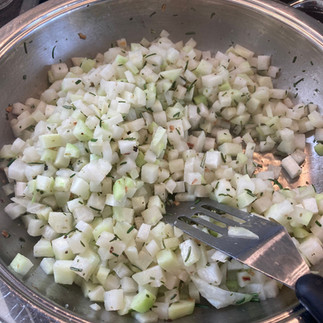 2. Die Kohlrabi schälen, in dünne Scheiben schneiden, die Scheiben in Streifen und diese in 4-5 mm große Würfel schneiden.