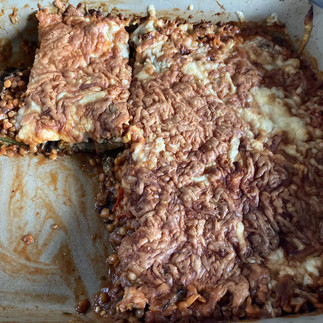7. In einer Auflaufform Auberginenscheiben, Zucchinischeiben und Linsenmischung übereinanderschichten.